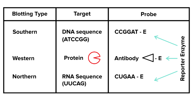 You’ve successfully separated mixtures of DNA, RNA, or proteins using gel electrophoresis—what’s next? In many cases, researchers are trying to identify specific strands of DNA or RNA or specific proteins. You can use various blotting methods to identify the specific DNA, RNA, or proteins that you are looking for. There are three general blots: Northern, Southern, and Western Blots. For each of these three techniques, you should be familiar with (1) the material that is being labeled (DNA versus RNA versus protein) and (2) the general technique that is used to label the target material.