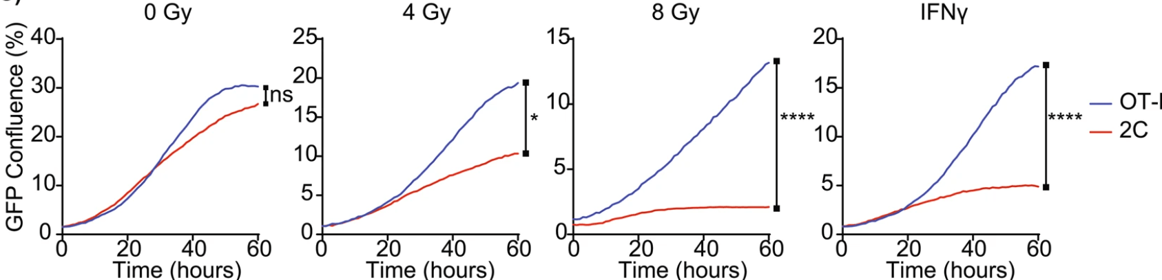 Figure 2: The GFP Confluence of Panc02SIY100 cancer lines, OT-1 and 2C following pretreatment with in vitro irradiation or IFNγ. GFP Confluence is proportional to SIY expression. Key: *p < 0.05; **p < 0.01; ****p < 0.0001